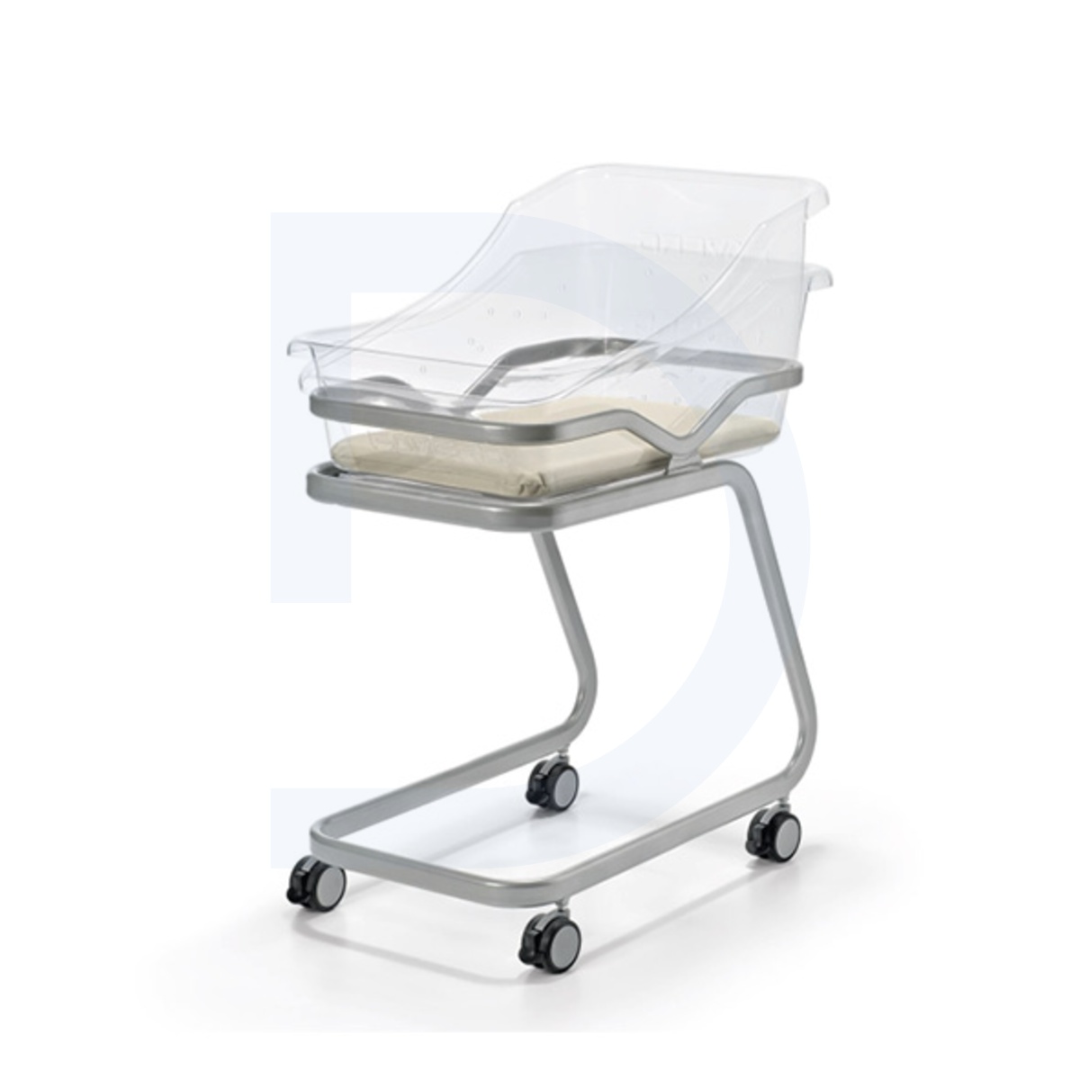 Het frame is gemaakt van epoxy-gecoate stalen buizen en uitgerust met vier zwenkwielen met dubbele wielen (Ø 75 mm) en individuele rem. De wieg bestaat uit transparant, schokbestendig kunststof met ventilatieopeningen voor een optimale luchtcirculatie. De gevoerde matras is afgewerkt met een gemakkelijk afwasbare kunststof hoes.